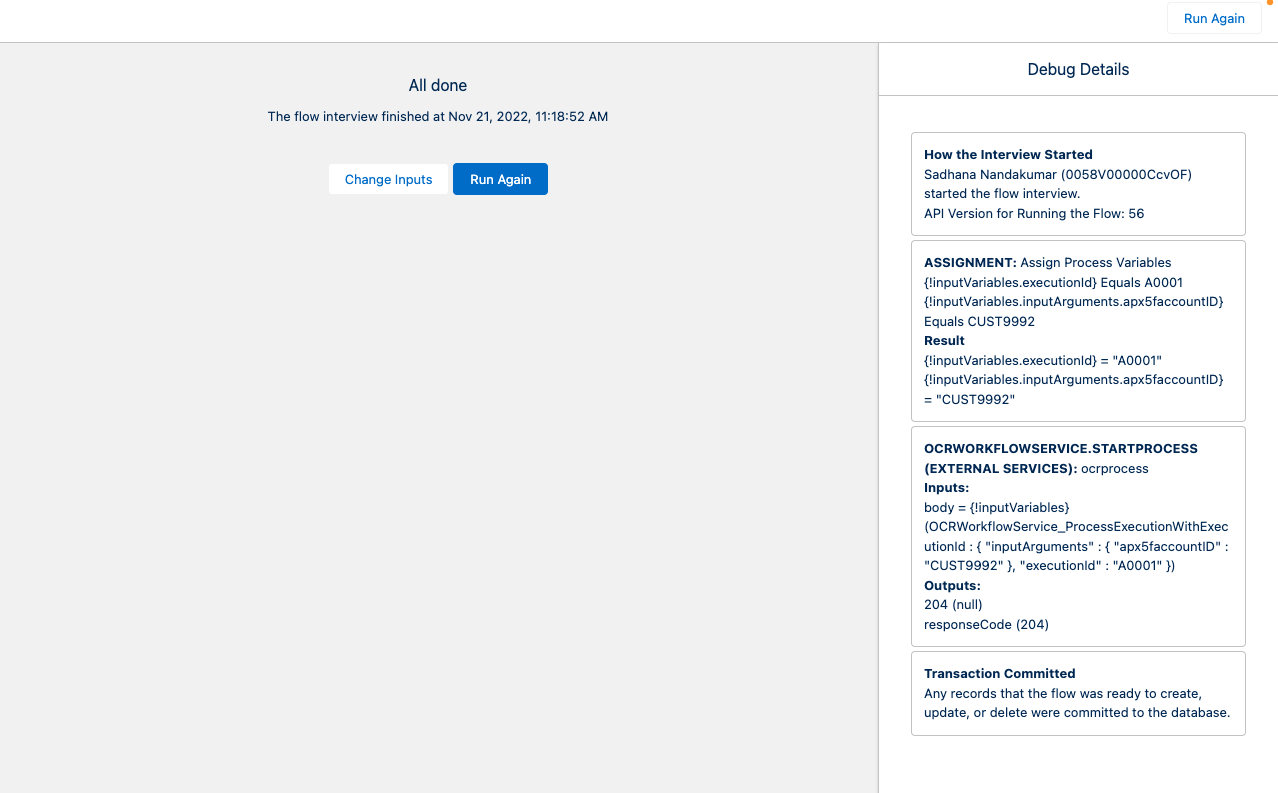 We can now debug the Salesforce Flow to trace how the RPA Process API is invoked from the flow.