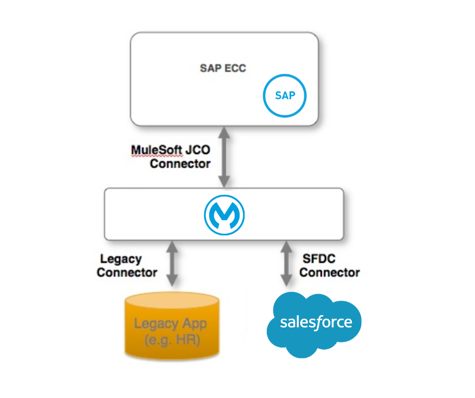 The MuleSoft JCo Connector rests above either Mule as an ESB or CloudHub and provides direct connectivity to SAP ECC. By employing other connectors such as our Salesforce.com connector, the platform (either Mule as an ESB or CloudHub) functions as middleware providing seamless integration between SAP ECC and SFDC. Users can easily invoke BAPIs (business application programming interface) and iDocs (intermediate document interface) in SAP to be used from one platform with ease. At a minimum, three components are required to fulfill the SAP connectivity solution: Mule as an ESB or CloudHub, the JCo Connector, and another endpoint connector (in this case the SFDC connector).